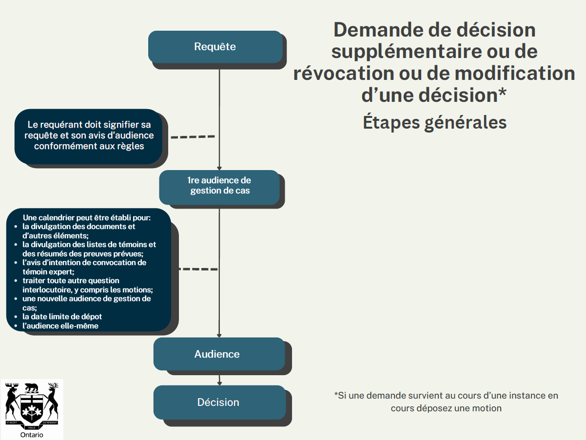 La demande de décision supplémentaire, de révocation ou de modification d’une décision ne sont pas la même chose que l’appel d’une décision. Les premières résultent généralement d’un changement de circonstances depuis la décision initiale. Un appel est généralement fondé sur l’argument selon lequel la décision initiale était erronée. Il faut l’interjeter devant la Cour divisionnaire de la Cour supérieure de justice de l'Ontario (voir le Guide de la procédure d’appel devant la Cour divisionnaire).